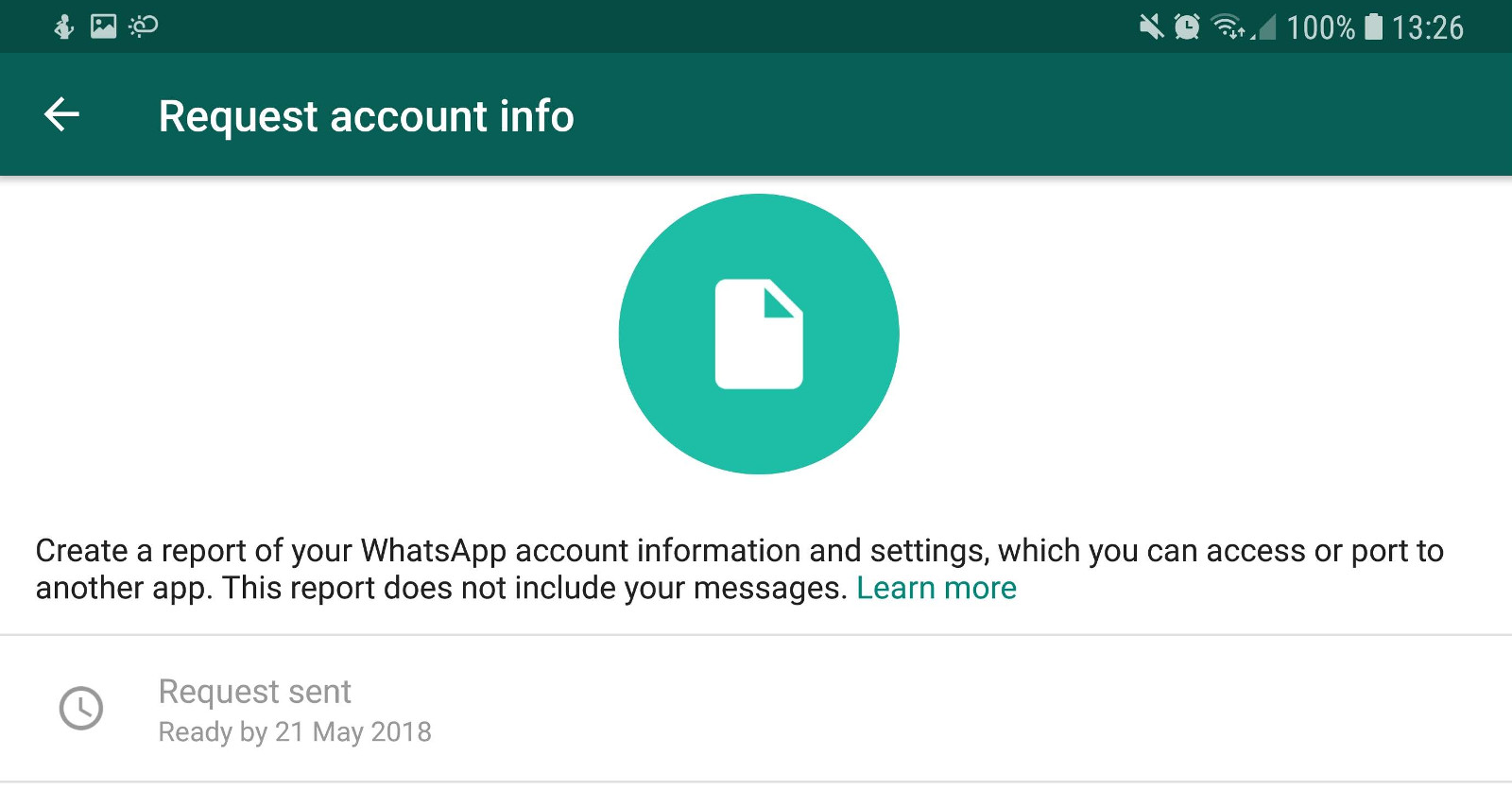 WhatsApp allows you to request a ZIP file of your account information and settings. This file will not include any messages, but your profile photo and whether you agreed to that Facebook data policy, group names, and the like. To get this report, go to Settings, and then tap on Account. Now find and tap on Request account info. Next, tap on the Request report option.