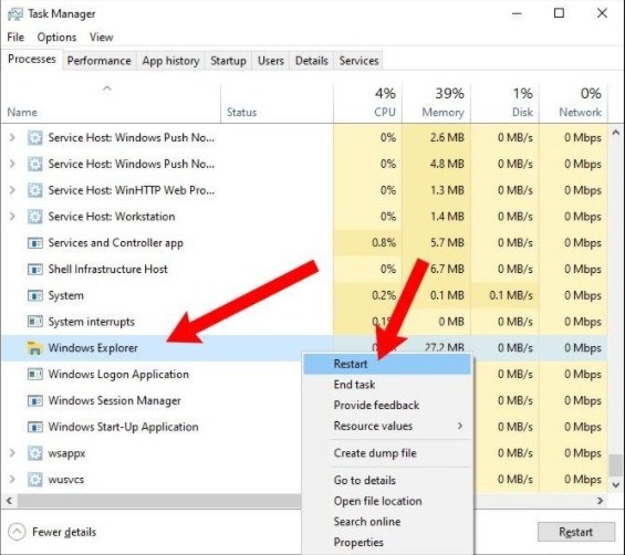 Step-2: In the Task Manager, find Windows Explorer. Right-click on it, and then click on ‘Restart.’